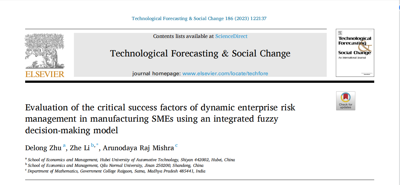 近日,公司信息管理系朱德龙教授以第一作者身份的研究成果《Evaluation of the critical success factors of dynamic enterprise risk management in manufacturing SMEs using an integrated fuzzy decision-making model》在创新管理领域国际顶级期刊《Technological Forecasting & Social Change》发表(SSCI 2022中国科公司一区期刊,TOP,ABS 3,影响因子10.884)。TapTap官方网站为第一署名单位。