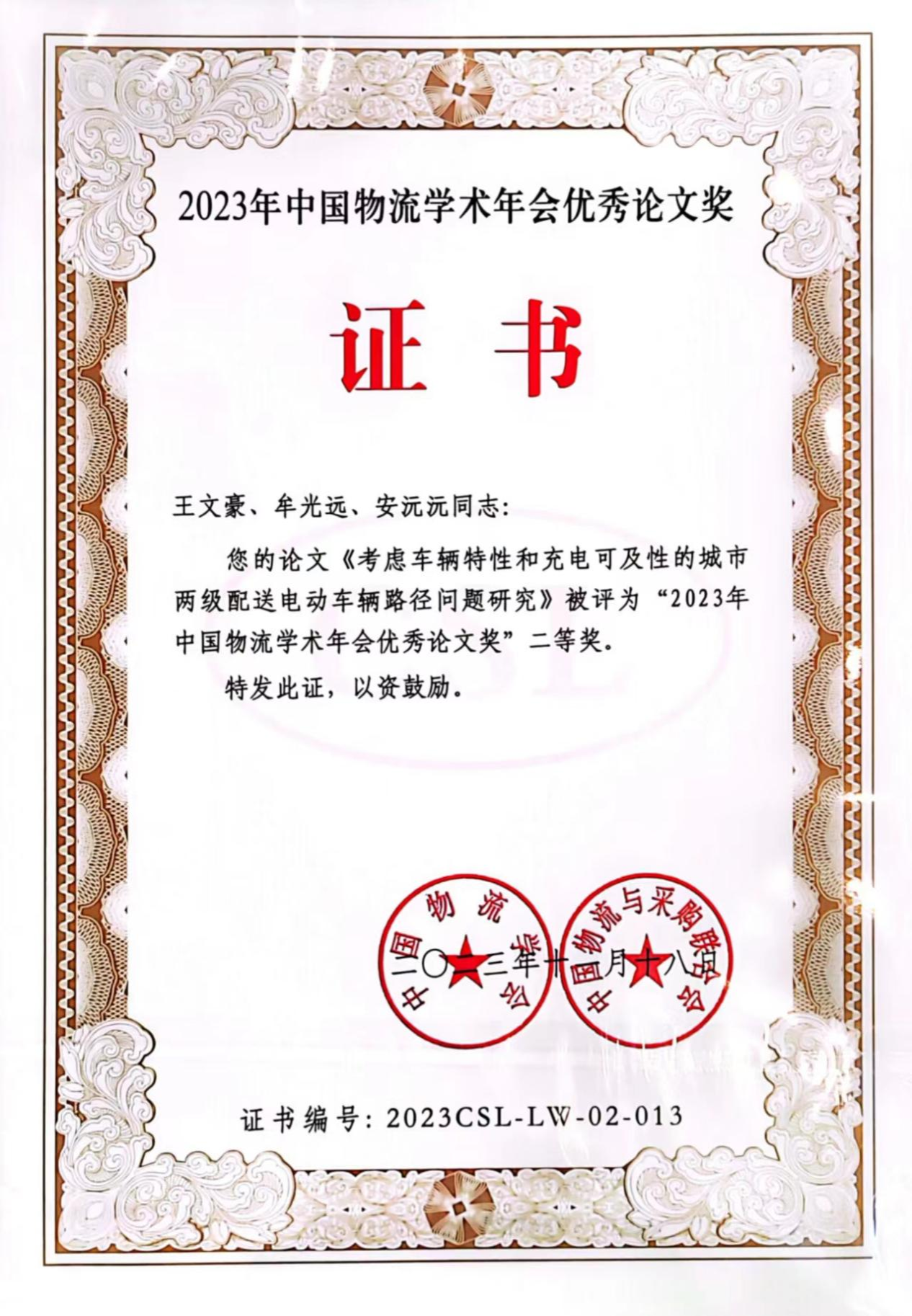 中国物流学术年会自2002年举办以来,每年参会人数逾千人,参与交流的论文、课题等研究成果超千件,已成为物流、采购与现代供应链领域展示最新研究成果,探讨前沿理论,拓宽学术视野、提升学术内涵、激发创新灵感的年度盛会。按照2023年中国物流学术年会论文征集要求,本届年会共收到来自369个单位,1742名作者的参评论文1106篇,经专家评审、网上公示,最终确定472篇论文获奖。包括:优秀博士学位论文14篇,一等奖10篇,二等奖23篇,三等奖216篇,优秀奖209篇。其中,公司管理科学与工程专业2021级研究生王文豪,2022级研究生牟光远、安沅沅所投论文“考虑车辆特性和充电可及性的城市两级配送电动车辆路径问题研究”获得2023年中国物流学术年会优秀论文二等奖。