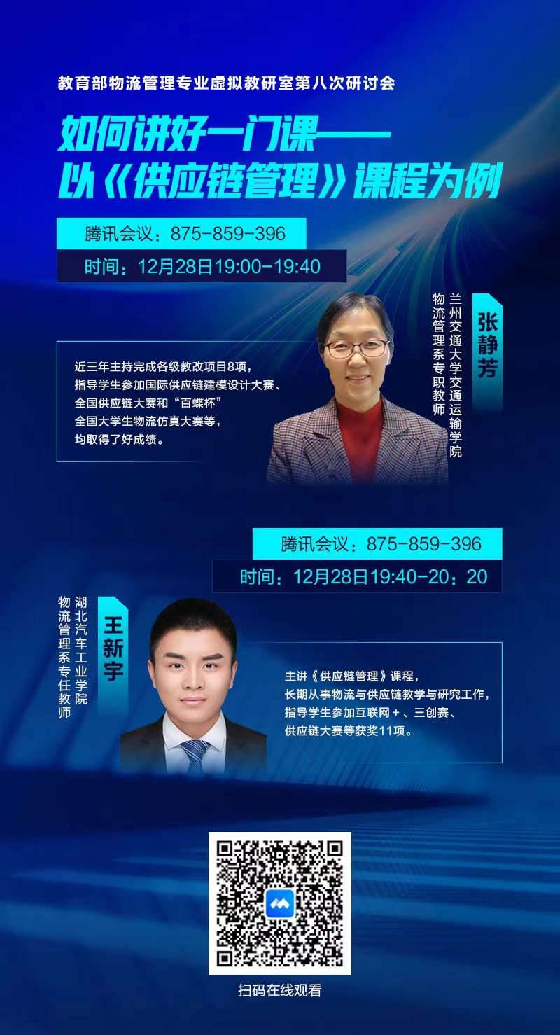 2023年12月28日,教育部物流管理专业虚拟教研室第八次研讨会线上会议成功召开,会议主题为“如何讲好一门课——以《供应链管理》课程为例”,经济管理公司青年教师王新宇应邀参加此次研讨会并做主题报告。