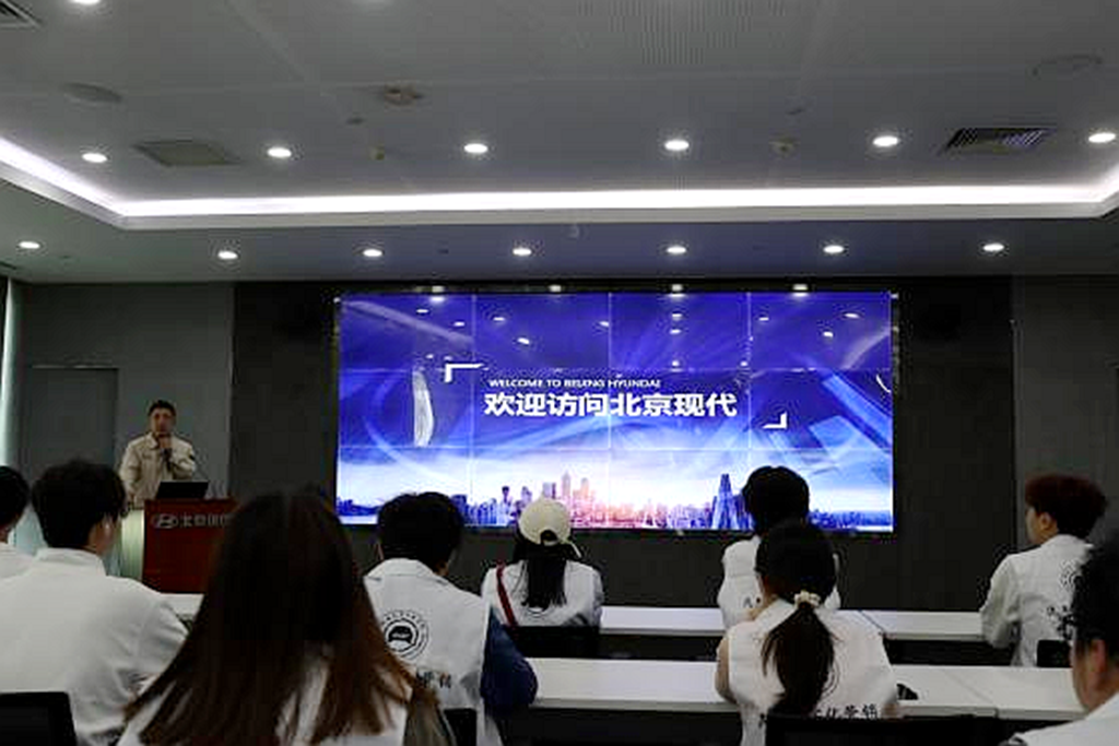 在北京现代汽车有限公司,北京现代人力资源部刘经理充分肯定了公司员工参加北京车展认识实习的做法,并为同学们介绍了当前汽车市场的竞争格局、技术创新以及消费者需求的变化,以及北京现代发展历史、主要车型、企业销售业绩和社会责任,使大家对中国汽车行业形势和前景有了更为清晰的认识。在北京现代仁和工厂总装生产车间,同学们见证了其“智”造实力,完整地观看了一台北京现代汽车的诞生过程。