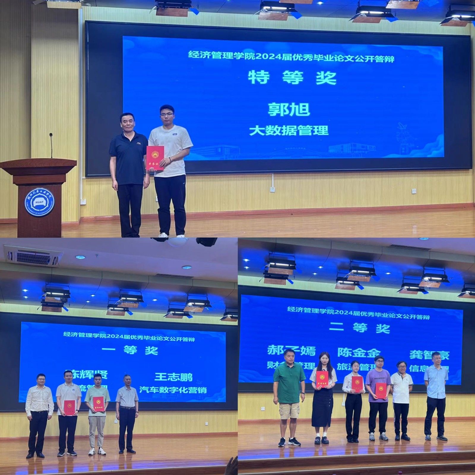 颁奖典礼上,主持人宣读了本次公开答辩中获得表彰的员工名单。大数据管理专业郭旭荣获特等奖;物流管理专业陈辉贤和汽车数字化营销专业王志鹏获一等奖;财务管理专业郝子嫣、旅游管理专业陈金金和信息管理专业龚智豪获二等奖。评委们为各位优秀员工代表颁发荣誉证书,并合影留念。