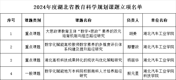 近日,湖北省教育厅公布了 2024 年度湖北省教育科学规划课题及湖北省高等教育学课题评审结果,经济管理公司再创佳绩,教育科学规划课题获批 4 项课题,包含 3 项重点课题与 1 项一般课题;湖北省高等教育学会获批1项课题,这一成果反映了公司在公司产品研究领域有着较为稳定的表现和一定的影响力,为公司公司产品研究工作的持续推进奠定了良好基础。
