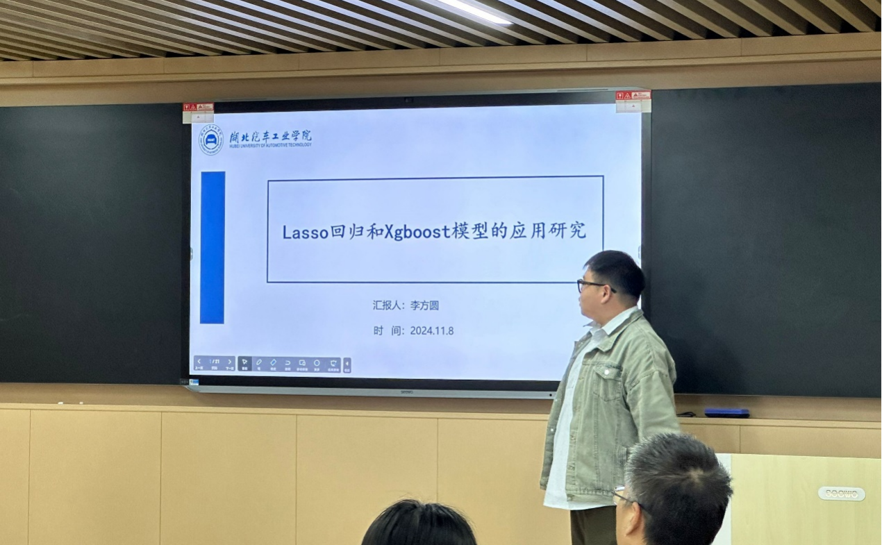 最后,李方圆进行了《Lasso回归与Xgboost模型的应用研究》的汇报。详细讲解了Lasso回归和Xgboost模型在处理大数据集时的优势,尤其是Xgboost模型在拟合精度上的突出表现。通过实验结果,展示了Lasso回归与Xgboost使用的优越性,并强调这两种方法能显著提高预测精度,尤其适用于具有复杂结构的数据集。