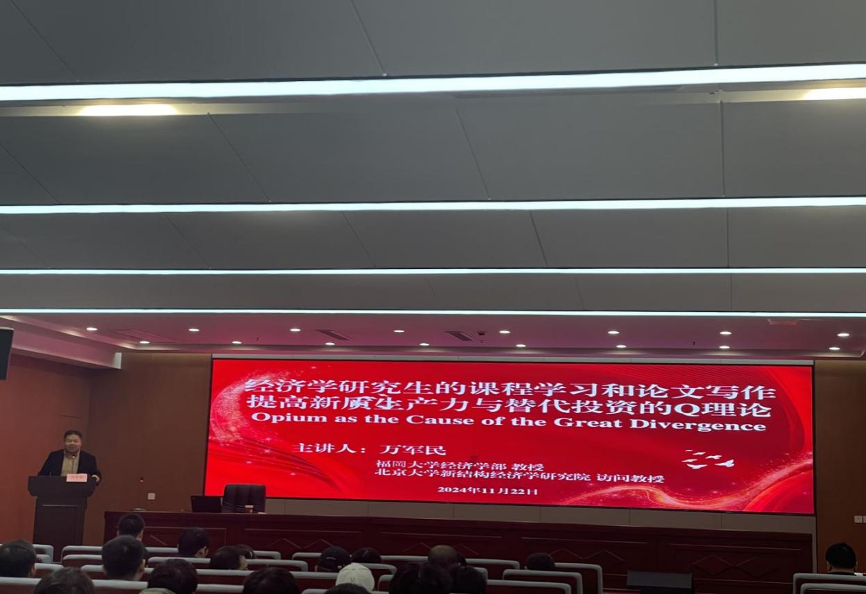 讲座上,万军民教授语言幽默,讲座内容丰富,他从经济学研究生课程学习和论文写作方法入手,阐述了在学术道路上要不断探索、不懈追求的心路历程;在学习的过程中,要对所学内容充满兴趣,才能保持持久的动力和热情;在具体的研究过程中,要善于观察身边的事物,从中发现研究线索。