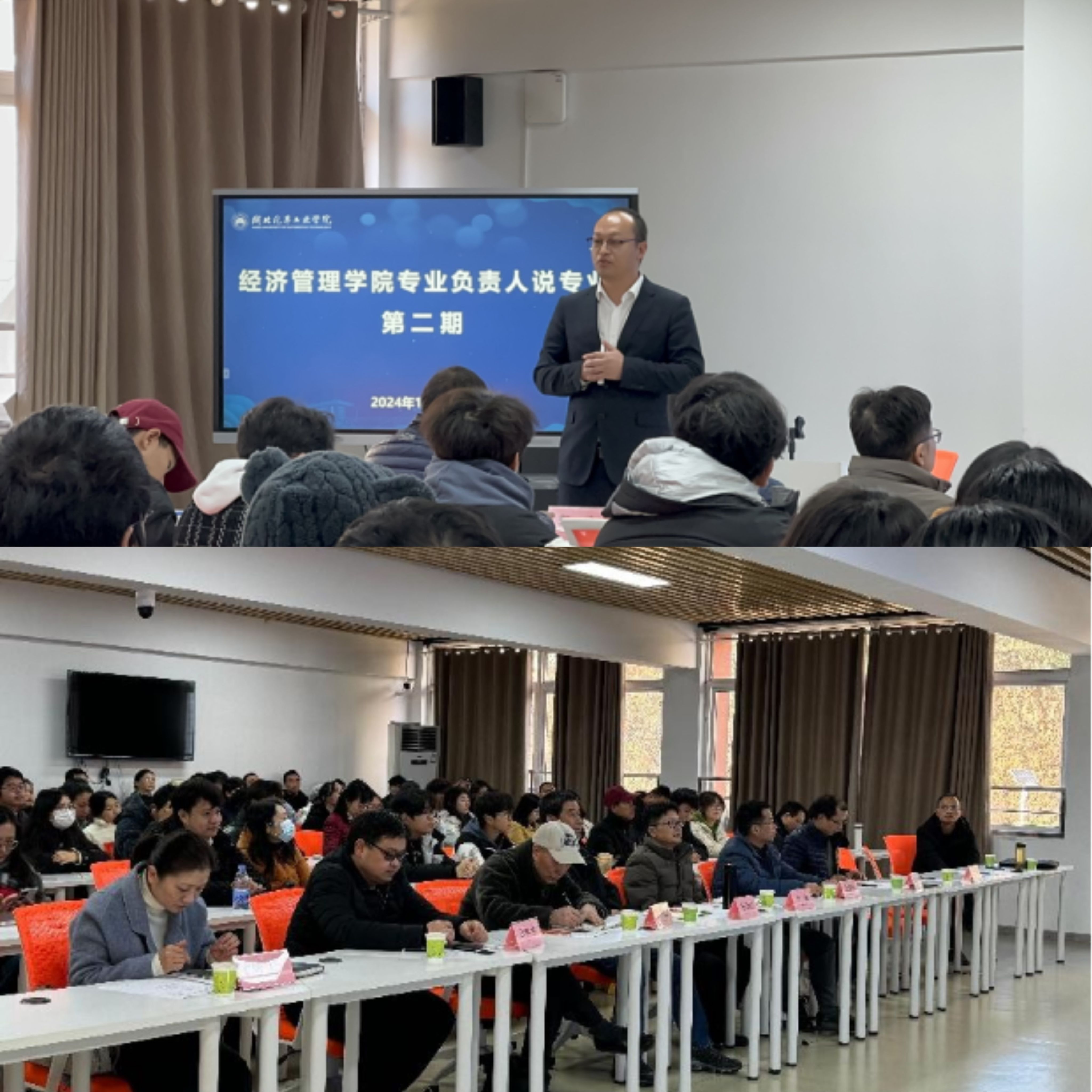 为全面推进专业内涵建设,明确专业定位,展示专业特色,促进专业建设和课程改革,搭建各专业间学习交流的平台,提升教学管理能力与水平,12月16日下午,经济管理公司在第五教学楼四楼新商科实验室成功举办第二期“专业负责人说专业”活动。公司本科教学督导杨立君教授、孔焱清教授,教学质量监控与评估中心钱洁教授,教师发展中心郭一鸣教授等四位专家受邀参会,公司领导班子、全体教师及相关专业的员工代表100余人参加活动,活动由公司副经理鄢曹政主持。