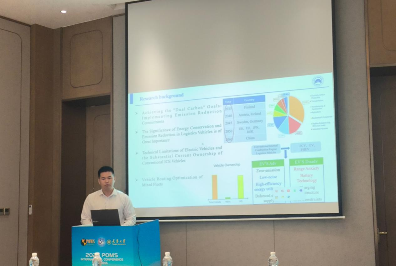 会上,公司研究生朱瑞雪作了题为“Research on Green Distribution Problems of Mixed Fleets Considering Charging Strategies”的报告。该报告针对油电混合车队的城市配送问题,提出了提出了考虑不同充电方式的混合车队配送模型,并根据研究问题改进自适应大领域搜索算法,旨在对混合车队中的电动车占比和电动车充电方式进行合理规划以降低车队运输成本。
