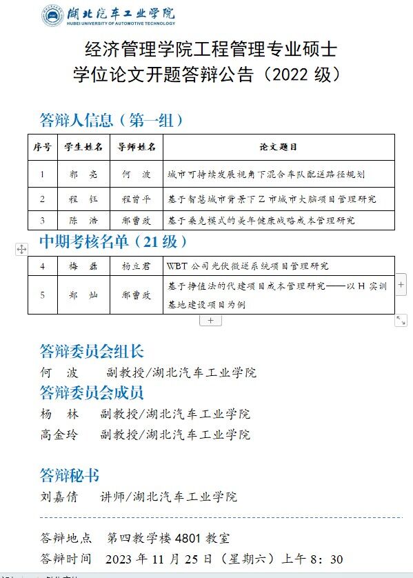 2022级工程管理硕士学位论文开题答辩公告