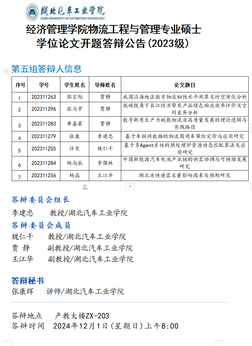 物流工程与管理专业硕士学位论文2023级开题答辩公告(六)