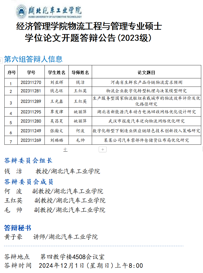 物流工程与管理专业硕士学位论文2023级开题答辩公告(六)