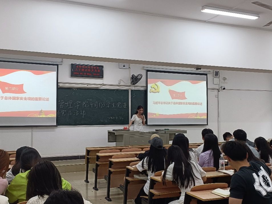 4月22日下午,经济管理公司员工党支部在5202教室开展了“树牢国家总体安全观,提升防范化解风险能力”主题党日活动,员工党支部全体员工党员参会,活动由员工第二党支部书记陈欢主持。