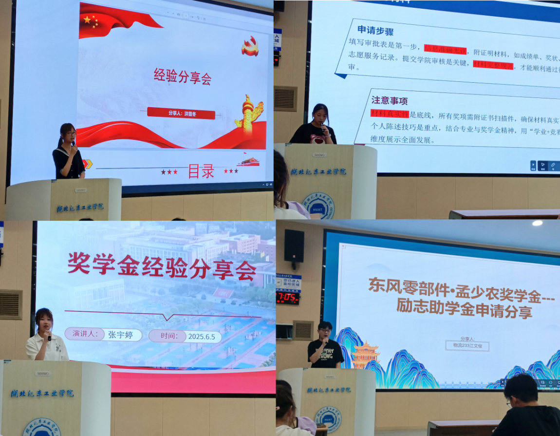 活动中,由奖学金获得者进行经验分享。蓝恩奖学金获得者洪雪冬、东方零部件·孟少农奖学金获得者张宇、东风·孟少农奖学金获得者张雨婷、东方零部件·孟少农奖学金获得者江文俊四位同学依次登台。他们从学科竞赛信息获取与备赛技巧到奖助学金体系的差异梳理等不同维度为同学们分享奖学金申请与成长成才的经验,赢得了现场师生的阵阵掌声。在互动交流环节,现场同学积极举手提问,就社会奖学金申请过程中的疑问和学习等问题与四位获奖者进行了深入交流。获奖者们耐心解答,结合自身经验给出了切实可行的建议。 分享环节结束后,屈田田老师作总结发言。她首先对四位分享者的精彩呈现给予高度评价,并提出三点期望:一是要坚守诚信底线,确保申报材料真实性,奖学金申请容不得半点虚假,这是诚信立身的基本要求;二是要关注家庭贫困员工入库问题,鼓励有需要的同学积极入库,公司会在助学金评定中优先考量,保障公平;三是肯定四位社会奖学金获得者的优秀,也祝贺在场人民奖学金获得者,勉励同学们以榜样为镜,在学业、实践中持续奋进,让青春在追求卓越中闪光。