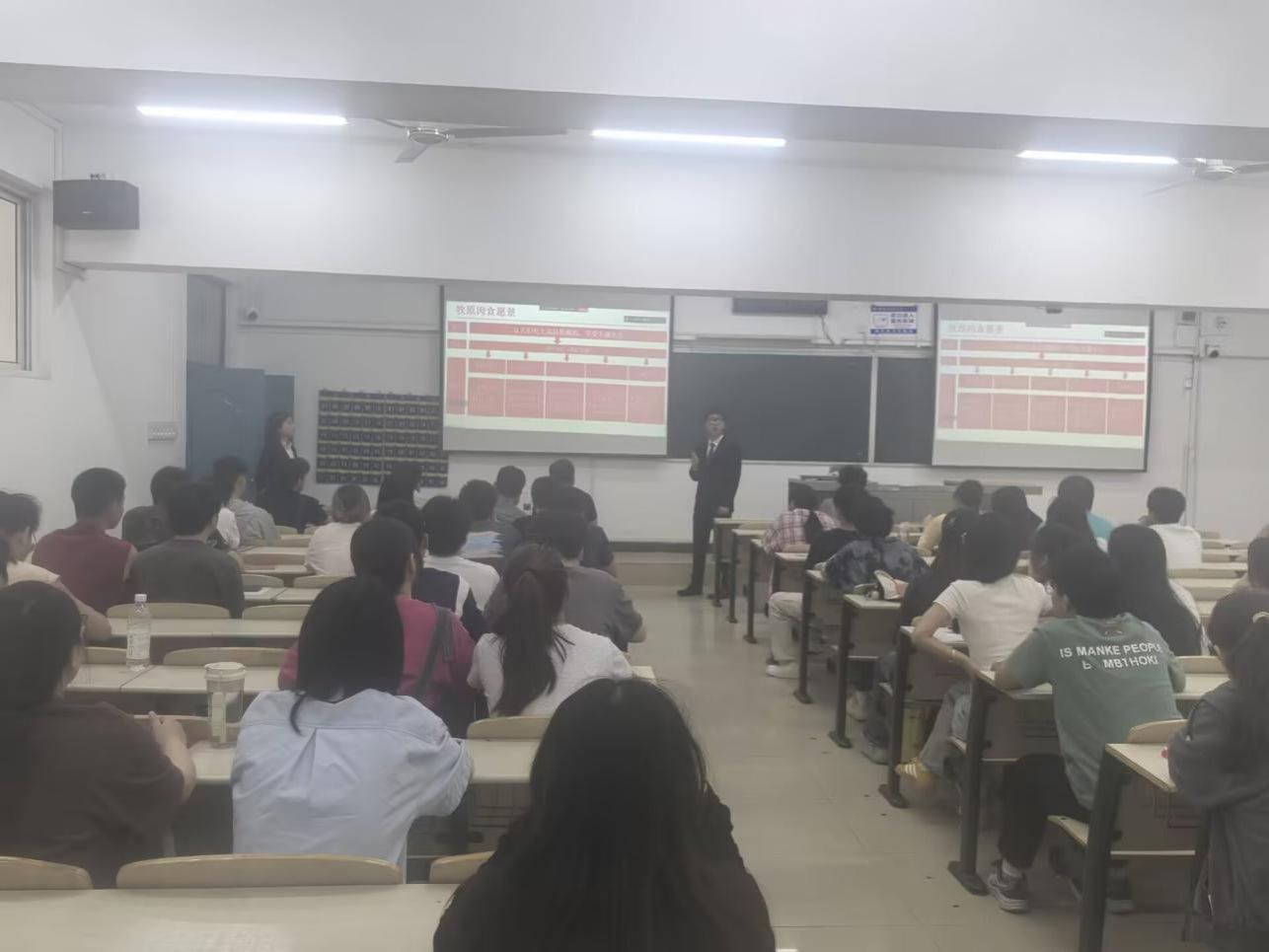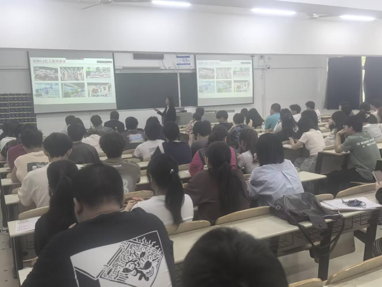宣讲会上,胡芸向同学们详细介绍了牧原食品的发展历程、业务布局和企业文化。牧原始终秉承“让人们吃上放心猪肉”的愿景,目前已形成集饲料加工、生猪育种、生猪养殖、屠宰加工为一体的猪肉产业链。袁浩博以自身职业成长经历为例,分享了在牧原的奋斗故事。2024年初入公司,从基层销售岗位做起,得益于公司完善的培训体系和丰富的市场资源,不断提升自我,逐渐崭露头角。凭借努力拼搏,2025年已从基层员工晋升为城市经理,实现了职业的快速进阶。在自由提问环节,同学们围绕薪资福利、工作环境、职业发展路径等问题,与胡芸、董冠宜、袁浩博进行了深入交流。