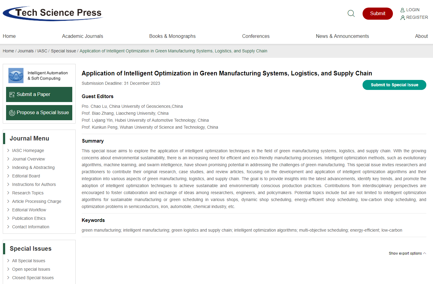 Application of Intelligent Optimization in Green Manufacturing Systems, Logistics, and Supply Chain