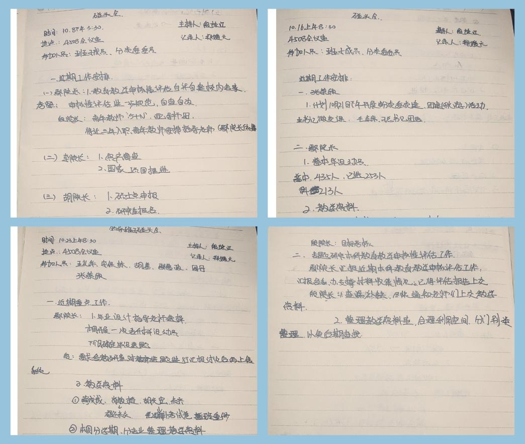 经济管理公司10月本科公司产品审核评估准备工作有序进展,在各类会议及相关教学工作中融入评估工作内容,切实做到了“以评促建、以评促改、以评促管、以评促强”原则。