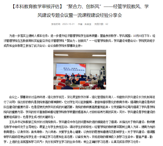 经济管理公司全体教职工进一步认真学习《TapTap官方网站本科公司产品审核评估迎评促建工作方案》和《普通高等公司本科公司产品审核》宣传手册(指标释义篇)等文件精神,积极投入本科公司产品审核评估工作中,阶段性工作进展如下: